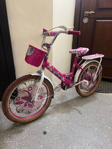 Uşaqlar üçün qız rəng çalarlarında velosiped. Xüsusiyyətlər: - Təxminən 18–20 düym təkərlər (şaquli uşaq ölçüsü) - Ön tərəfdə kiçik səbət - Arxa baqaj dəmirliyi - Rəngli çiçək naxışlı çərçivə və o...