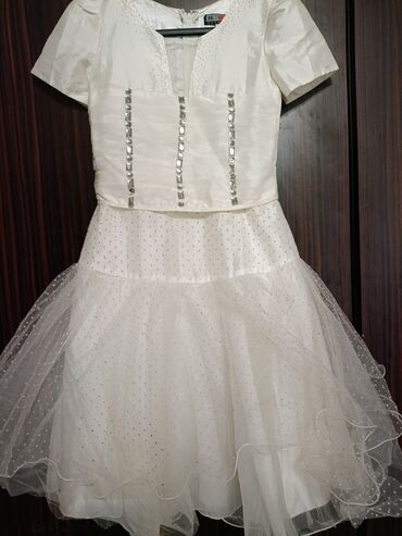 Ağ rəngli qısa ziyafət ,ad günü üçün don. 13-15 yaşlı incə qızlara uyğundur.1 dəfə geyinilib. - Model: kvadrat dekolteli, beldən yığma, ətəyi kloş (tam dairə) kəsim - Qol: həcmli “puf” qollar, ela...
