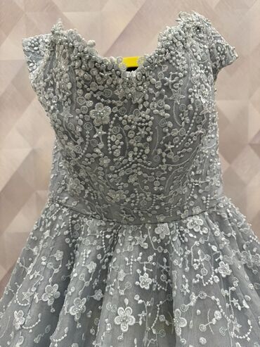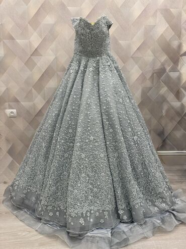Gümüşü-boz rəngdə, tam ətəkli balıqquyruğu olmayan ziyafət/gecə paltarı. Bütünlükdə incə güllü və muncuqlu aplikasiyalarla bəzədilmiş tül parçadan hazırlanıb. Üst hissə bədənə kip oturan, yumşaq V-yarım dairəvi dekolte xətti və kiçik qapax-çiyin detalları ilə. Bel xəttindən geniş açılan çoxlaylı, həcimli ətək əlavə tüllə dəstəklənib; ətəyin alt kənarında dalğa formasında qatlar var. Naxışlar çiçək və budaqlanma motivlərindədir, paltar boyunca sıxlıq fərqli səviyyədə davam edir. Rəngi zərif parıltı effekti yaradır, foto və tədbirlər üçün ideal. Uşaq/yeniyetmə ölçülərinə uyğun formal siluet. Nəfəsalan astar və yüngül parça qatları ilə rahat geyim. Ziyafət, mərasim, rəqs və xüsusi günlər üçün uyğundur.