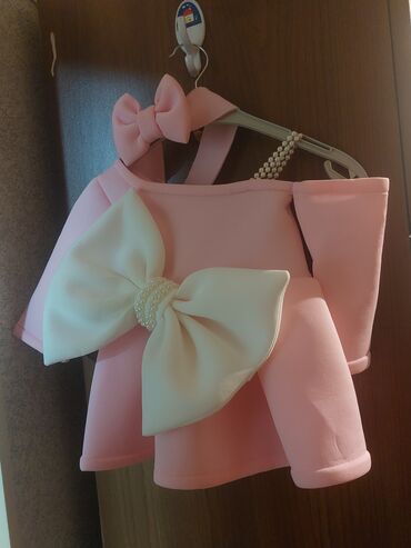 Qız uşağı üçün ziyafət paltarı - Rəng: açıq rozovı/şampan tonları - Üst hissə: atlas parça üzərində qızılı güllü naxış və parıltılı detal - Bəzək: beldə atlas lent və kiçik bant - Etek: çoxqatlı t...