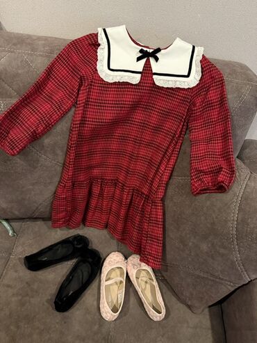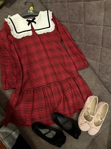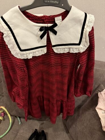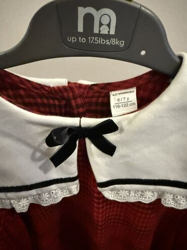 - Don: LC Waikiki, ölçü 6/7 yaş (etiketdə 116–122 sm göstərilib). Qırmızı-qara xırda dama naxışlı parça, ətək hissəsi büzgülü. Ağ, kvadrat formalı geniş yaxa – kənarları krujeva və qara zolaqla işlənib, mərkəzdə qara bant (qurdelin).40 azn almışam
