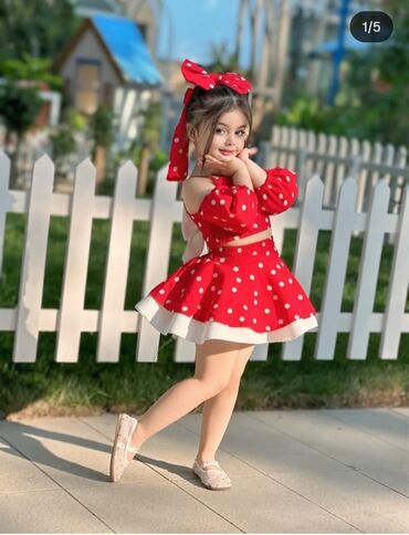 Kiçik qızlar üçün nəzərdə tutulmuş bu qırmızı rəngli paltar, ağ rəngli nöqtələrlə bəzədilib. Paltar iki hissədən ibarətdir: kəsilmiş yuxarı hissə və qısa ətək. Yuxarı hissədə açıq çiyinlər və qısa, enli qollar var. Ətək qatlı dizayna malikdir və alt hissəsi ağ rəngdədir. Böyük qırmızı bant paltarın arxa tərəfində yerləşir və ümumi görünüşə şirinlik qatır. Bu dəst xüsusi günlər, ad günləri və ya gündəlik istifadə üçün uyğundur.