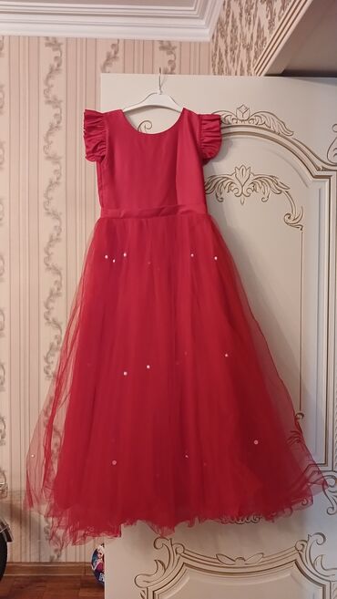 Qız uşağı üçün bayramlıq/qonaqlıq paltarı - Rəng: qırmızı (bordo tonlarında) - Üst hissə: parıltılı payetli material, qısa qol - Etek: çoxqatlı tül, dizdən aşağı uzunluq, yüngül və həcimli - Bel h...