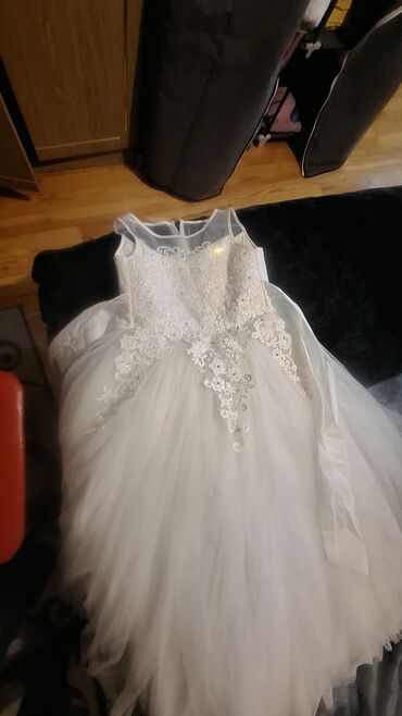 Ağ rəngli qız uşağı üçün ziyafət/libas paltarı - Model: uzun, tam ətəkli, tül qatlı A-kəsim - Üst hissə: incə gipür teksturalı bodi, şəffaf yuxarı panel və yumru yaxa - Bel: atlas qurşaq, yan hiss...