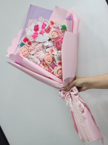 - Qız uşaqları üçün hədiyyə buketi: Açıq çəhrayı bükülmüş kompozisiya. İçində dekorativ güllər və müxtəlif saç aksesuarları (saç rezinləri, tokalar, klipslər, bəzəkli stickerlər, fiqurlu və kəpənəkli detallarla) toplanıb. Zərif lent və bəzəkli bağla təqdim olunur – ad günü, körpə şənlikləri və ziyarətlər üçün uyğun.