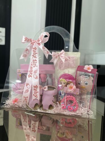 - Yeni doğulan qız üçün hədiyyə səbəti/çantası: Şəffaf saplı qutuda pastel çəhrayı temalı seçmə. Daxilində bebek baxım dəsti (daraq, qayçı və s.), yumşaq ilk sandal/ayaqqabı, corablar, tematik oyuncaqlar, saç rezinləri və aksesuarlar, dekorativ lentlər “Baby girl” yazılı. Səliqəli doldurucu ot parçaları ilə vitrin görünüşlü təqdimat.