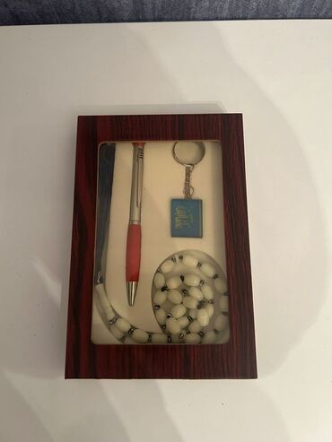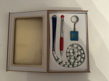 Hədiyyə dəsti – elegant qutu içində Dəst tərkibi: - Təsbeh: Ağ oval muncuqlu, metal ara bəndlərlə, klassik dizayn. - Qələm: Gümüşü gövdə, qırmızı tutacaq hissə, üstündə toxunma başlığı tipli qırmı...