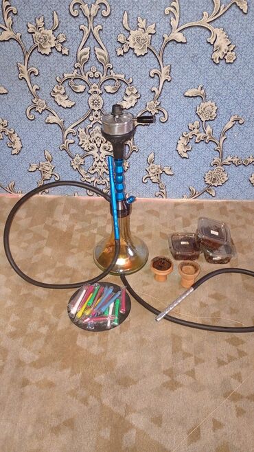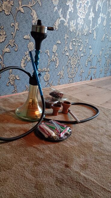 - Şüşə kolbaya malik kalyan: şəffaf-sarı tonlu kolba, mavi metal şaxta, silikon şlanq və metal ağızlıq