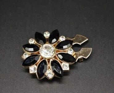 - 1 ədəd qara-ağ daşlı çiçək formalı bəzək klipsi – qızılı tonlu baza üzərində fasetli qara daşlar, mərkəzdə iri şəffaf daş; geyim, yaylıq, şal və ya papaq üzərində dekorativ vurğu kimi istifadə oluna bilər.