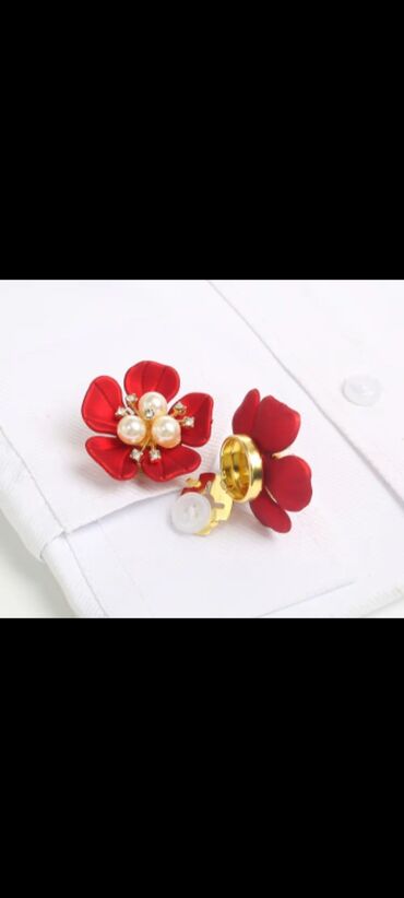 - 1 cüt qırmızı çiçək formalı qol düyməsi – mərkəzdə incə görünümlü mirvarilər və xırda parlaq daşlarla, qızılı rəngli əsas və mexanizm. Kişi köynəklərinin manjetinə uyğun, sürüşməyən arxa fiksator.