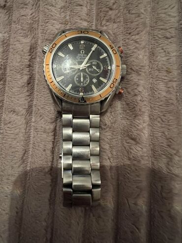 - Qol saatı 2: OMEGA loqolu “Seamaster” üslubunda xronoqraf. Qara siferblat, üç alt-siferblat, tarix pəncərəsi, dönər bezel (narıncı tonlu işarələr 10–50), metal qolbaq və yan düymələr/tac.