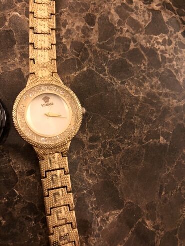 - Qızılı rəngli metal qol saatı: dairəvi korpus, açıq ağ rəngli siferblat, çərçivədə bəzək daşları, qızılı metal halqalı qolbaq (zəncirvari, relyefli bəndlər), siferblatda “VERSACE” yazısı və loqo. Mexaniki göstəricilər: saat və dəqiqə əqrəbləri.