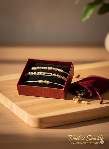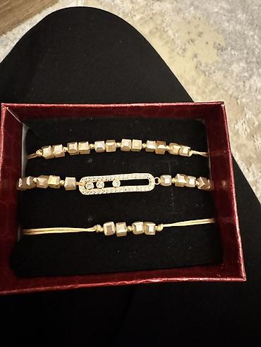 - Dizayn: Minimal və zərif üslubda üç fərqli qolbaq; ikisi qızılı rəngli iplərdə çoxüzlü kvadrat bəndlərlə, biri isə ortasında kristallarla bəzədilmiş oval formalı metal elementlə.