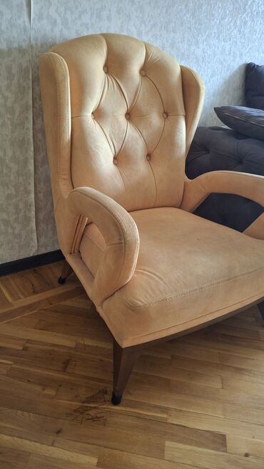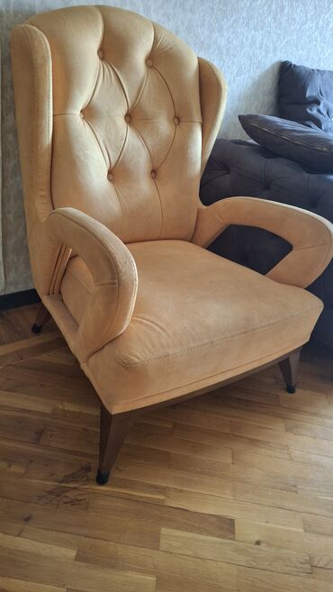 Tək nəfərlik yumşaq kreslo 2 eded 100azn - Rəng: tünd boz - Material: məxmərə bənzər yumşaq parça, dekorativ düymə detallar - Dizayn: geniş oturacaq, yüksək bel hissəsi, yumşaq qol dayaqları - Kark...