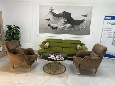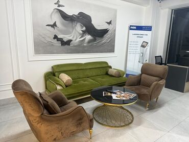 - 1 ədəd 3 nəfərlik divan – yaşıl rəng, yumşaq məxmər tipli parça, dekorativ tikişlər, yan hissələrdə relyefli döşəmə, iki ədəd silindrik dekor yastıq