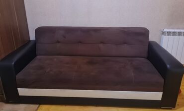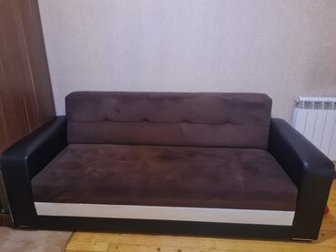 - Dizayn: qəhvəyi yumşaq parça oturacaq və arxa hissə, qara eko‑dəri yanlıqlar, alt hissədə krem rəngli dekorativ zolaq