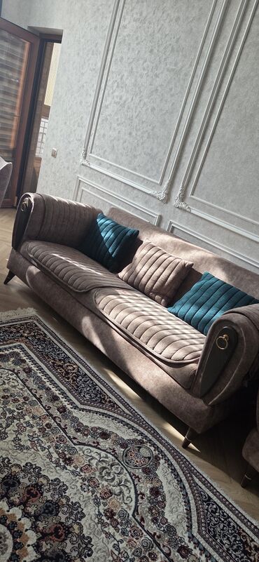 Hamisi bir yerde 180 azn.Klassik dizaynlı 3 parçalı yumşaq mebel dəsti Tərkib: - 1 ədəd üçnəfərlik divan - 2 ədəd geniş birmənlik kreslo - 5 ədəd dekorativ yastıq Xüsusiyyətlər: - Bej rəngdə, rel...