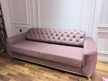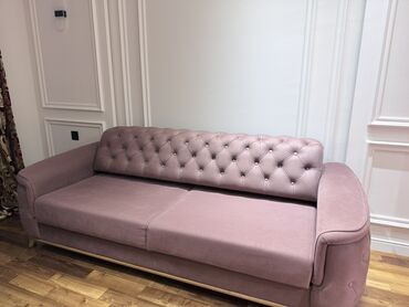 Mebel dəsti – müasir salon və ev interyeri üçün Komplektin tərkibi: - Qabarma xətli, yarımdairə formalı 3 nəfərlik divan (mət bənövşəyi/çəhrayı ton), 2 ədəd dekor yastıqla - Yumru formalı tək nəfə...