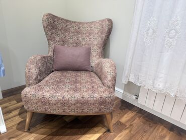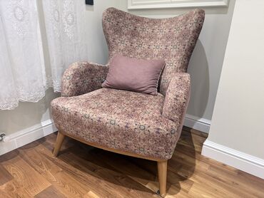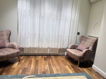 - 2 ədəd kreslo – quşqanadı formalı bel hissəsi, rahat enli oturacaq, eyni üslubda dekorativ naxışlı parça. Hər kreslo ilə uyğun rəngli dekor yastıq.