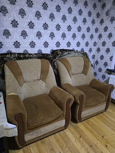 Qonaq otağı üçün yumşaq mebel dəsti - Tərkib: 1 ədəd geniş kreslo + 1 ədəd divan - Rəng: qəhvəyi-bej kombinasiyası - Material: yumşaq parçalı üzlük, toxunuşda xalça-kimi zərif, dekorativ zolaqlı a...