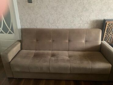 - Divan: neytral bej rəngli yumşaq parça; düz xətlərə malik müasir dizayn; oturacaq və arxa hissədə düyməli tikiş bəzəyi; geniş qol dayaqları; üçnəfərlik ölçü, dərin oturacaq.