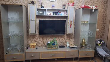 Şüşə qapılı vitrinlər, televizor üçün mərkəzi bölmə və əşyalar üçün çəkmələrdən ibarət qonaq otağı divar mebeli. Bu mebel dəsti, məişət əşyaları və bəzək əşyalarını səliqəli şəkildə yerləşdirmək üçün ideal həlldir. Parlaq səthləri və qızılı vurğuları ilə hər hansı bir interyerə müasir və zərif bir görünüş qatır.