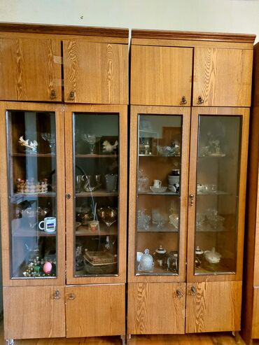 Vitrinli böyük dəst şkaf - Material: taxta/MDFlam, şüşə qapılar - Rəng: açıq qəhvəyi karkas, tünd qəhvəyi orta panel və rəflər - Üst hissə: 6 bölmə, hərəsində şüşə vitrin qapıları və içəridə şüşə ...