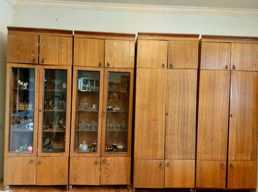 Məhsul: Taxta mebel dəsti və daxili qapılar - Divar boyu modul şkaf: 2 hissədən ibarət iri kompozisiya. Üst bölmələrdə dumanlı şüşəli vitrin qapıları, içəridə rəflər. Orta hissədə açıq niş sahələr...