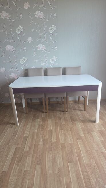 - Yemək masası: ağ parlaq üst səth, bənövşəyi dekorativ lent, yuvarlaqlaşdırılmış künclər, silindrik ağ ayaqlar. Ailə və qonaqlar üçün geniş ölçü.