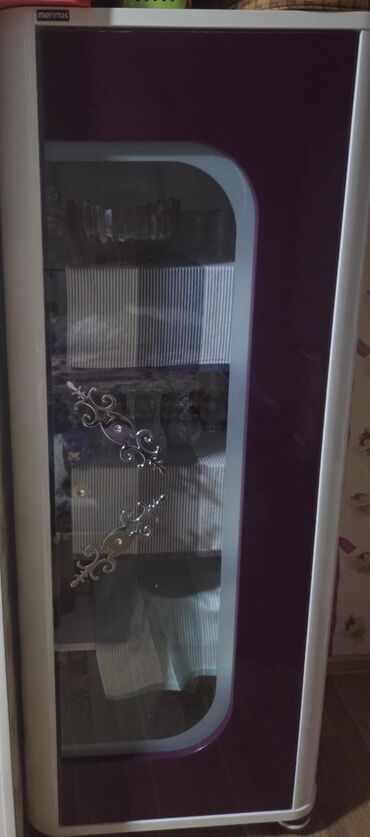 - Vitrin şkaf (Merinos): bənövşəyi-ağ çərçivə, ön şüşə qapı, üzərində ornamental metal elementlər. Daxildə bir neçə rəf – qab-qacaq, dekor, kolleksiya əşyaları üçün ideal.
