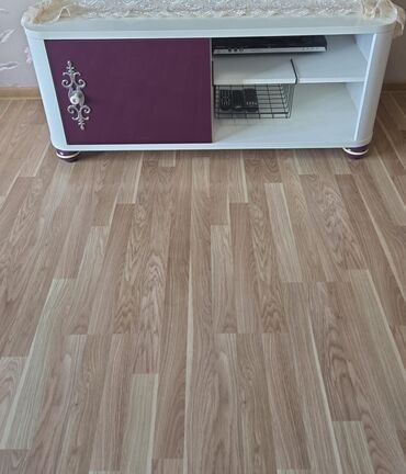 - TV altlığı/komod: ağ karkas, bənövşəyi qapı, dekorativ metal tutacaq/naxış. Açıq rəf zonası TV-pristavka, pult və aksesuarlar üçün; əlavə tel səbət ilə.