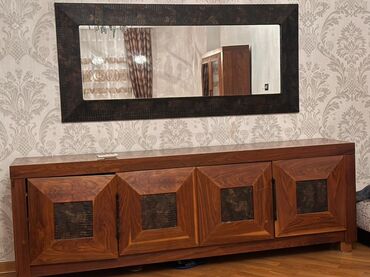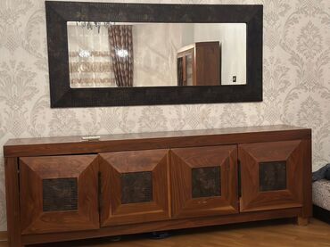 - Güzgülü konsol: 4 qapılı, iri saxlama bölmələri. Ön panellərdə dərin kəsimli dekorativ çərçivələr və tünd teksturalı mərkəz elementləri. Üst hissədə divardan asılan iri düzbucaqlı güzgü (eni böyük, qalın tünd çərçivə).