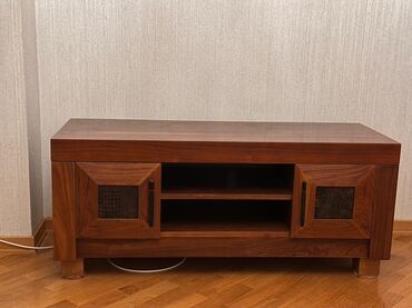 - TV stendi: ortada açıq iki rəf (televizor avadanlığı üçün), sağ-sol tərəfdə qapalı bölmələr; qısa hündürlüklü möhkəm ayaqlar.