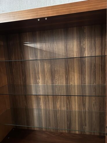 - Vitrin şkaf: iki şüşə qapılı, içəridə şüşə rəflər; aşağıda geniş çəkməcə. Ön çərçivələr konsolla eyni üslubdadır, tutacaqlar tünd metaldır.