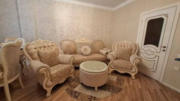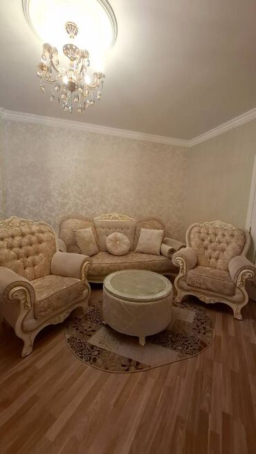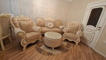 Rəng palitrası: bej/krem tonları, qızılı detal və ornamentlərlə. Klassik və zərif qonaq otağı üçün tam komplekt.