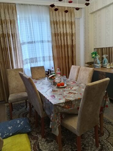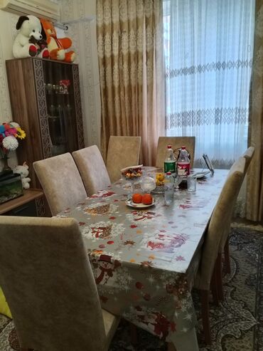 - Yemək masası və 8 ədəd stul. Yumşaq oturacaq və bel hissəsi, ağac ayaqlar. Düzbucaqlı acilan masa səthi.