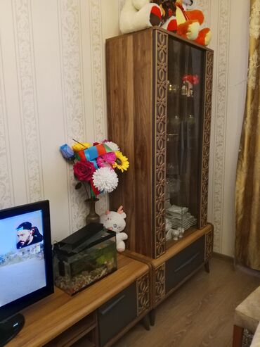 - TV altlığı ilə birlikdə şkaf-vitrin komplekti. Təbii ağac fakturalı korpus, ön paneldə naxışlı dekor elementləri. Vitrin hissəsi şüşəli, içərisi rəflidir; alt bölmələrdə tutacaqlı qapalı saxlama yerləri.