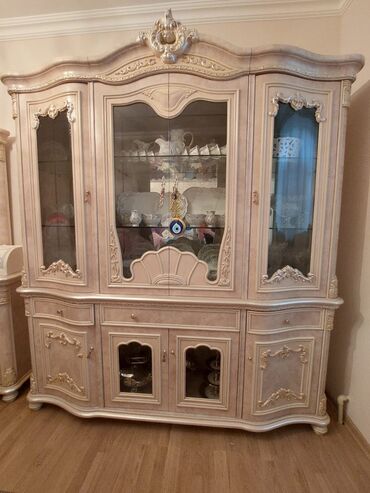 Klassik üslubda qonaq otağı üçün mebel dəsti - Komod + böyük güzgü və vitrin şkafdan ibarət dəst - Zəngin qəhvəyi-qızılı tonlarda, klassik oyma detallı fasadlar - Korpus: taxta əsaslı, dekorativ p...Giriş•Qeydiyyat