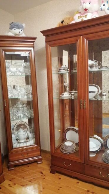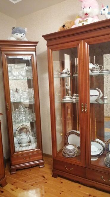 Ağac fakturalı, tünd qəhvəyi rəngdə iri divar mebeli dəsti. Xüsusiyyətlər: - Bölməli vitrin hissələri: şüşəli qapılar, rəflər – qab-qaşıq, kitab və dekor üçün əlverişli - Bağlanan dolab hissələri:...
