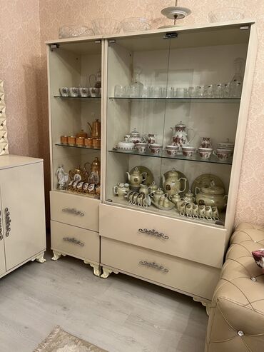 Açıq rəngli taxdan hazırlanmış vitrin və komod dəsti - Vitrin: Ön hissəsi sürüşmə şüşə qapılı, 2 ədəd möhkəm şüşə rəfli. Yanlarda xrom rəngli metal dayaqlar, aşağıda kiçik kilidləmə mexanizmi görü...