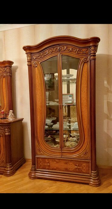 Mebel dəsti – böyük divar vitrini və xalça - Klassik üslubda iri divar vitrini: taxta fakturalı korpus, şüşəli yan və orta vitrinalar, üst bölmələrdə qapılı şkaflar, aşağıda geniş çekmece və dolab...