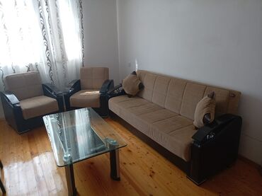 Qonaq otağı mebel dəsti - Tərkib: 1 ədəd geniş divan, 2 ədəd kreslo, 1 ədəd qəhvə/çay masası - Rəng və material: tünd qəhvəyi parça oturacaq və arxa hissə, açıq bej yan panellər; yan hissələrdə de...