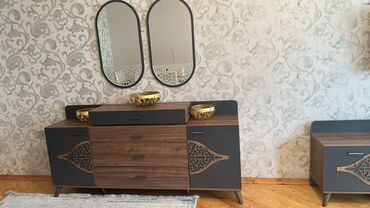 - Güzgülü komod: 2 ədəd oval güzgü, ortada 3 geniş çekmece, yuxarıda nazik aksesuar bölməsi, hər iki tərəfdə qapalı şkaf bölməsi.