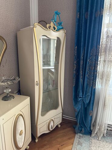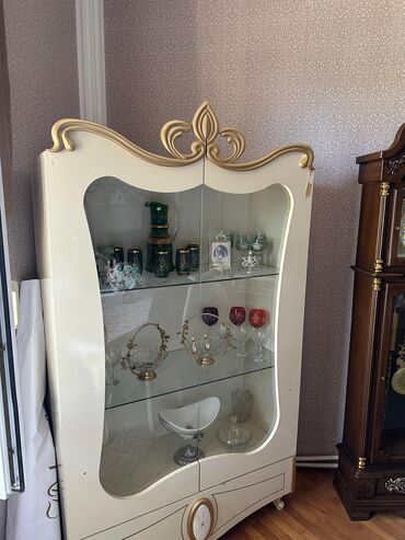 - Material: MDF/ləklə işlənmiş taxta, şüşə vitrin qapıları, metal dekorativ tutacaqlar