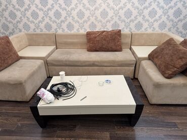 - Yumşaq künc divan: bej rəngli, modullu quruluş; künc və yan modulların üstündə inteqrə edilmiş krem rəngli sərt səthli masaçalar. 3 iri qəhvəyi dekor yastığı.