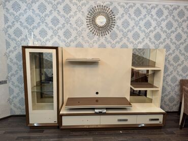 Mebel dəsti – TV stendi və vitrinli divar modulları - Müasir dizayn: bej, ağ və qəhvəyi tonların kombinasiyası, asimmetrik dekor xətləri və geometrik dəstək elementləri. - Komplekt tərkibi: - Mə...