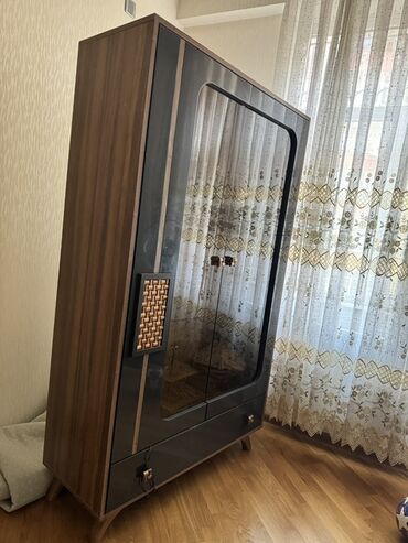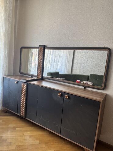 - Material: laminat/MDFlam səth, dekorativ teksturalı panel detalı; metal/taxta dayaqlar.