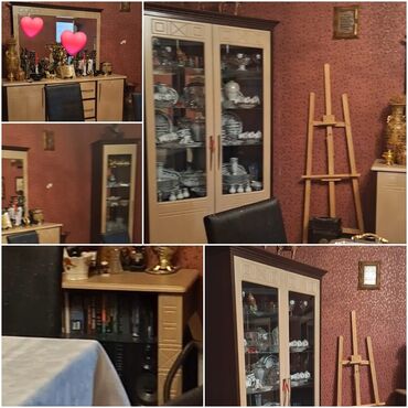 - Şkaf-vitrin (2 qapılı): şüşə qapılar, içəridə rəflər qab-qacaq və dekor üçün, yuxarı hissədə dekorativ naxışlı panel, iki rəngli dizayn.