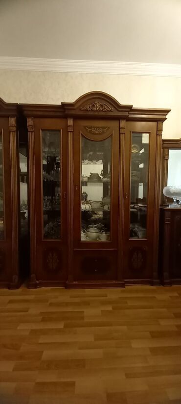 Klassik üslubda taxta qonaq otağı mebel dəsti Tərkibi: - Böyük vitrin-bufet: yuxarı hissəsi şüşəli vitrin qapıları, daxilində şüşə rəflər və güzgülü arxa panel; aşağı hissəsində qapalı bölmələr və...