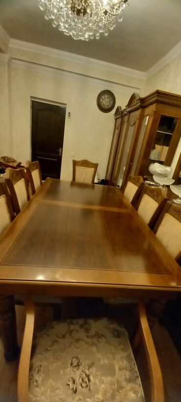 Klassik üslubda bəzək oyma detalları ilə massiv taxta qonaq otağı dəsti. Tərkibi: - Böyük vitrin-bufet: yuxarı hissəsi şüşəli 3 qapılı vitrin, içəridə gücləndirilmiş şüşə rəflər və güzgü arxa pane...